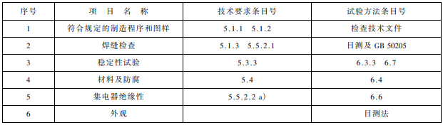 6 1 焊縫檢驗采用目測法 6 2 環境適應性檢測 6 2 1 溫度用 0 ~ 100 ℃溫度計測定。 6 2 2 pH 值測定按 GB / T 6920 進行。 6 3 性能試驗 6 3 1 運行速度用秒表和鋼尺測量、計算求得。 6 3 2 可靠性、耐久性試驗 空載試驗不少于 8 h;負荷試驗不少于 72 h。正常運行平均無故障工作時間和使用壽命根據用戶 調查確定。 6 3 3 穩定性試驗 出廠檢驗時其傳動部分在制造廠內組裝后進行,型式檢驗應在負荷試驗或正常運行時進行。 a)用鉗形表測量工作電流; b)各部位溫升應在開機 2 h 后用溫度計測量。 c)噪聲測量按 GB / T 3768 進行。 6 4 涂裝質量檢驗 a)漆膜厚度使用電磁式漆膜測厚儀測量; b)外觀用目測法檢驗; c)漆膜附著力按 GB / T 1720 的規定進行檢驗; d)如表面進行熱噴涂應按 GB / T 9793 進行檢測。 6 5 主梁的撓度測量,應在安裝以后進行,用鋼絲和直尺測得。 6 6 絕緣電阻采用兆歐表測量。 6 7 過力矩保護裝置的可靠性用力矩試驗機測量。 6 8 集電器耐壓試驗,在 2 000 V 試驗電壓的條件下做耐壓試驗 1 min,無擊穿現象。 6 9 中心回轉支承中滾道和鋼球硬度根據 JB / T 2300 的檢測方法,用硬度計測量。