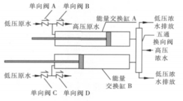 低壓原水從單向閥 A 或單向閥 C 進入能量回收裝置,充滿能量交換缸 A 或 能量交換缸 B;高壓濃水從五通換向閥進入能量回收裝置,當(dāng)五通換向閥使高 壓濃水與能量交換缸 A 連通時,高壓濃水將能量傳遞給低壓原水,實現(xiàn)能量交 換,高壓原水從單向閥 B 進入反滲透膜壓力容器進行脫鹽處理;待將能量交換 缸 A 中的原水全部加壓送至反滲透系統(tǒng)后,五通換向閥,將高壓濃水與能量交 換缸 B 連通,重復(fù)上述能量交換過程,同時能量交換缸 A 中低壓原水進入,排 出低壓濃水。兩個能量交換缸交替進行高壓濃水與低壓原水的能量交換,實現(xiàn) 將低壓原水連續(xù)增壓送至反滲透系統(tǒng)進行脫鹽處理。