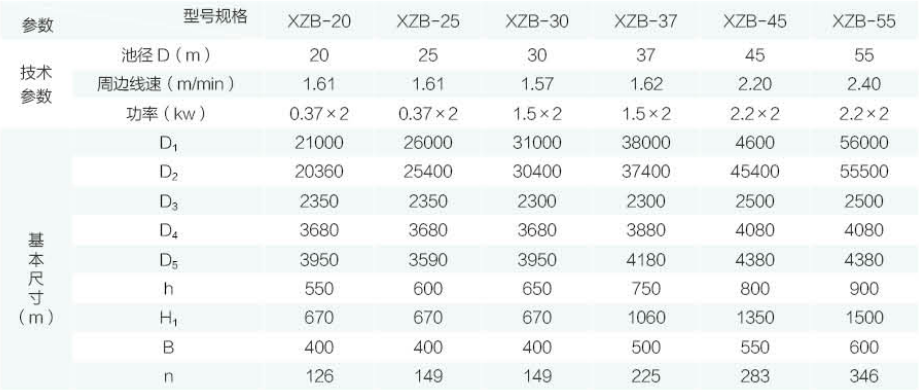 XZB型吸泥機一般用于大型(一般指流量大于500m3/h) 污水處理工程的幅流式沉淀池,特別適用于二沉池池底污 泥的刮集及外排。池形一般采用中心進水、周邊出水、中 心排泥,池底可不設坡度(平底結(jié)構(gòu)),二沉池使用尤為廣 泛。水面浮渣、浮沫等雜物可由浮渣刮集裝置刮排至池外 渣坑或渣斗。靜壓排泥依靠各個管口閥門,調(diào)節(jié)流量流至 中心泥缸直接外排。虹吸排泥主要是利用真空泵抽真空進 行二次虹吸提升排泥力矩變化范圍較大的場合,可采用帶力矩保護裝置的軸裝 式減速機。
