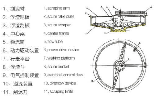 特點:該機(jī)采用中心傳動垂架式,下部采用整體對數(shù)螺線刮 板,上部設(shè)有浮渣收集裝置,池壁四周設(shè)溢流裝置及浮渣 排出裝置。該機(jī)傳動機(jī)構(gòu)為行星擺線針輪減速機(jī)與帶外齒 的大型回轉(zhuǎn)支承二級減速具有傳遞扭矩大,運(yùn)轉(zhuǎn)平穩(wěn),穩(wěn) 流效果好等優(yōu)點。